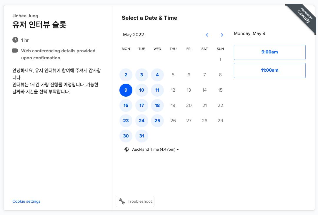 이렇게 캘린더리에서 시간을 설정하여 저장하고 난 후, 이 링크를 고객사에게 보내면 이런 화면으로 나타납니다. 그래서 그들이 가능한 시간대를 선택하면 자동으로 컨펌 이메일이 저와 그 해당 사람에게 전달이 됩니다.