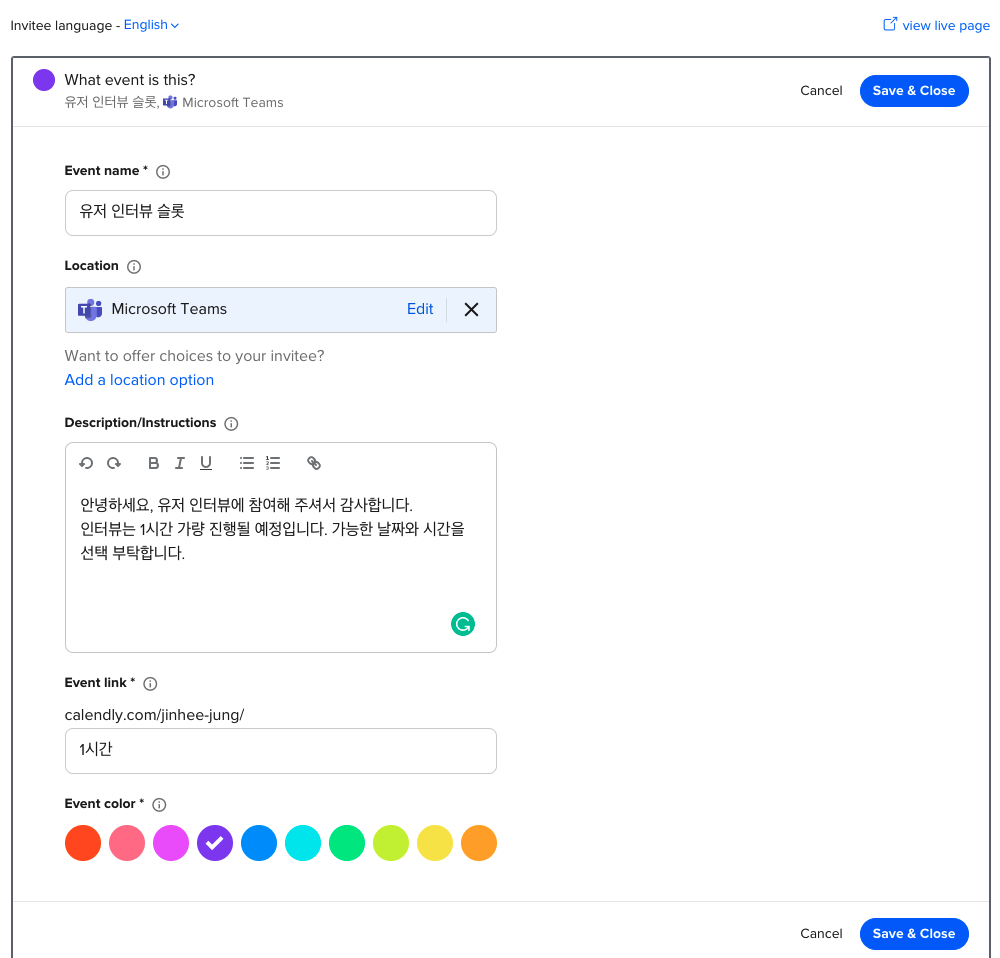 먼저 유저 인터뷰에 응해 준 사람의 시간을 우선적으로 맞춰야 하는 것도 중요하지만, 자신이 언제 시간이 가능한지를 알아야 하는 것이 우선입니다. 캘린더리를 사용하여 내가 인터뷰 할 수 있는 날짜와 시간을 슬롯으로 설정해 줍니다.