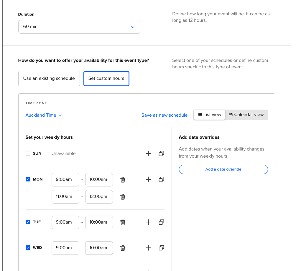 이벤트에 대한 대략적인 설명 작성 그리고 내가 가능한 시간을 설정 해 줍니다. 저는 월/화/수 아침 9시부터 10시까지, 월요일은 11시부터 12시까지 시간이 가능하다고 설정했습니다.