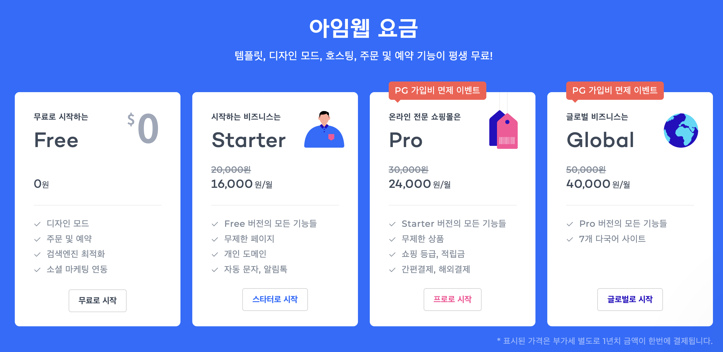한국 시장에 포커스를 두고 만든 웹사이트 빌더 서비스 아임웹(https://imweb.me/)